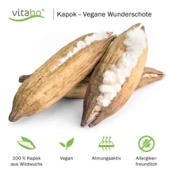 Liegen wie auf Wolken – die Kombination der nachhaltigen Materialien Baumwolle und flauschig weichem Kapok sorgen für ein natürliches Liegegefühl. Die Schote des Kapokbaums wird wild von Hand geerntet und trägt damit zu einem gesunden Ökosystem und dem Erhalt des Urwalds bei. Sanft schlummern mit Verantwortungsbewusstsein.