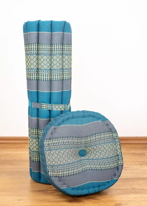 Ob solo oder im Team, das praktische Set aus Zafukissen und Steppkissen bereichert deinen Alltag. Egal wo du deine Entspannungsmomente suchst oder eine komfortable Sitzmöglichkeit haben möchtest, die Kissen lassen sich im Wohnraum und auch draußen und unterwegs nutzen. Das hohe, runde Zafukissen mit Knopf in der Mitte erleichtert das natürliche Sitzen im Schneidersitz und sorgt dafür, dass der Rücken beim Sitzen gerade bleibt. Das große Steppkissen dient als Sitzpolster auf dem Balkon, im Garten, beim Camping oder bei einem Picknick. Auch als Polster für Palettenmöbel oder auch zum bequemen Sitzen auf einem Boot machen die Kissen den strahlenden Sommertag noch schöner. Dein Stück Thailand ist stets dabei und spendet dir und deinen Liebsten Urlaubslaune und Gemütlichkeit.