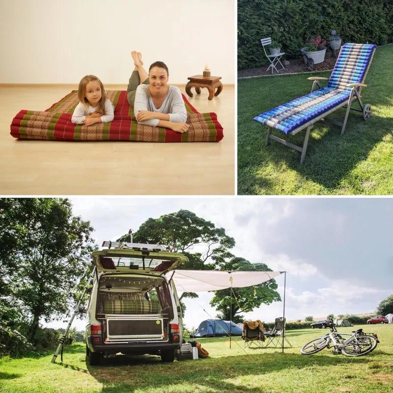 Dein Wohnraum wird zum Platzwunder, wenn du die klassischen Möbel durch multifunktionale Lieblingsstücke wie der Rollmatte XL in Doppelbettgröße ersetzt. Dein Bett kann mit der Rollmatte ein bodennaher, formfester Futon werden – so erlebst du die asiatische Art des Schlafes. Dein Sofa kann ausziehen, wenn du die Rollmatte als Entspannungsoase im Wohnzimmer nutzt. Kombiniert mit Kissen entsteht eine Liegewiese, die dir und deinen Liebsten einen gemütlichen Platz bietet. Nachts dient die Rollmatte als Gästebett. Auch dein Outdoor-Abenteuer im Van begleitet die Thaimatte. Ob im Zelt, im Kofferraum oder unter freiem Himmel – die Matte spendet eine komfortable Liegefläche.