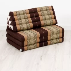 Das dreieckige Thaikissen mit drei Auflagen begeistert mit seinem fernöstlichen Design. Die farbenfrohen Kissen versprühen überall gute Laune und machen so richtig Lust, sich an einen weit entfernten, einsamen Strand zu träumen. Die Thaimatte ist einfach ausklappbar und lässt sich platzsparend zusammengeklappt in die Ecke stellen. Das formfeste Kissen besticht besonders durch seine inneren Werte: Die Füllung besteht aus feuchtigkeits- und wärmeisolierender Kapokfaser – dank ihr gestaltest du auch auf feuchtem und kühlem Untergrund eine gemütliche Liegeinsel (was ist Kapok? Das erfährst du hier.)