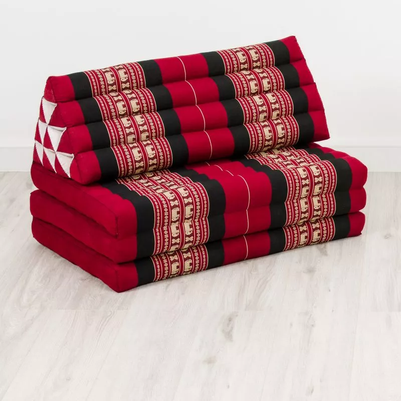 Das dreieckige Thaikissen mit drei Auflagen begeistert mit seinem fernöstlichen Design. Die farbenfrohen Kissen versprühen überall gute Laune und machen so richtig Lust, sich an einen weit entfernten, einsamen Strand zu träumen. Die Thaimatte ist einfach ausklappbar und lässt sich platzsparend zusammengeklappt in die Ecke stellen. Das formfeste Kissen besticht besonders durch seine inneren Werte: Die Füllung besteht aus feuchtigkeits- und wärmeisolierender Kapokfaser – dank ihr gestaltest du auch auf feuchtem und kühlem Untergrund eine gemütliche Liegeinsel (was ist Kapok? Das erfährst du hier.)